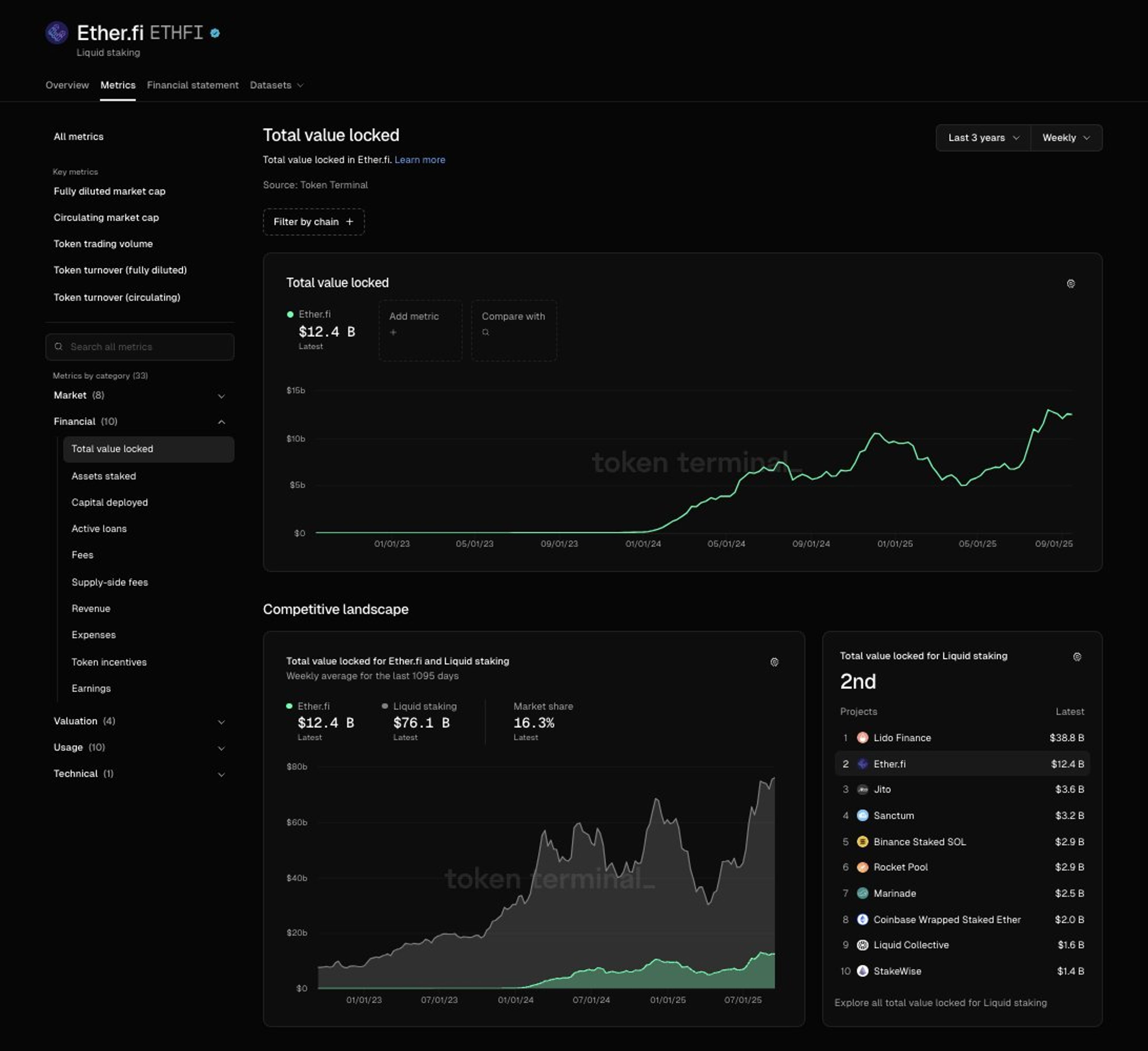 For a liquid staking project like Ether.fi, the standardized metrics include total value locked, fees, revenue, daily active users, and more.