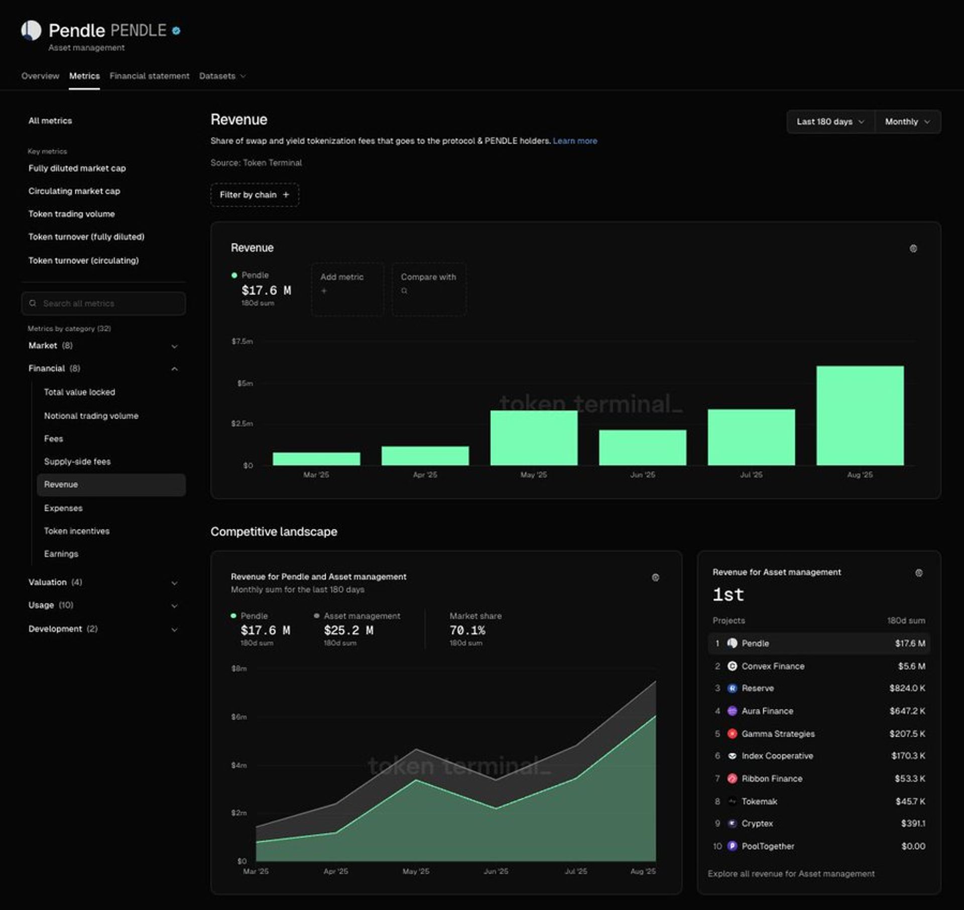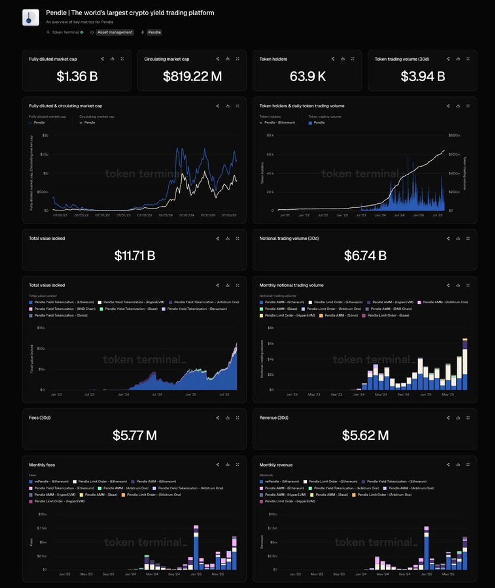 “By partnering with Token Terminal, we’re able to benchmark our performance against the competition in a fair and accurate way. Having a real-time dashboard on Token Terminal is not only a great tool for our team, but for all Pendle stakeholders.”
